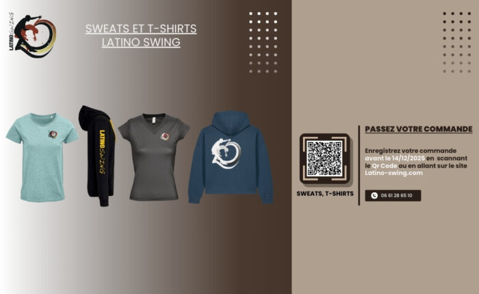 Nous lançons une nouvelle campagne de commande pour nos vêtements estampillés LATINO SWING. Cette année, nous vous proposons de nouveaux t-shirts pour femmes, ainsi que de nouveaux sweats pour femmes et hommes. Pour ces derniers, vous aurez le choix entre broderie ou flocage, et vous pourrez également profiter d’une palette de couleurs élargie.